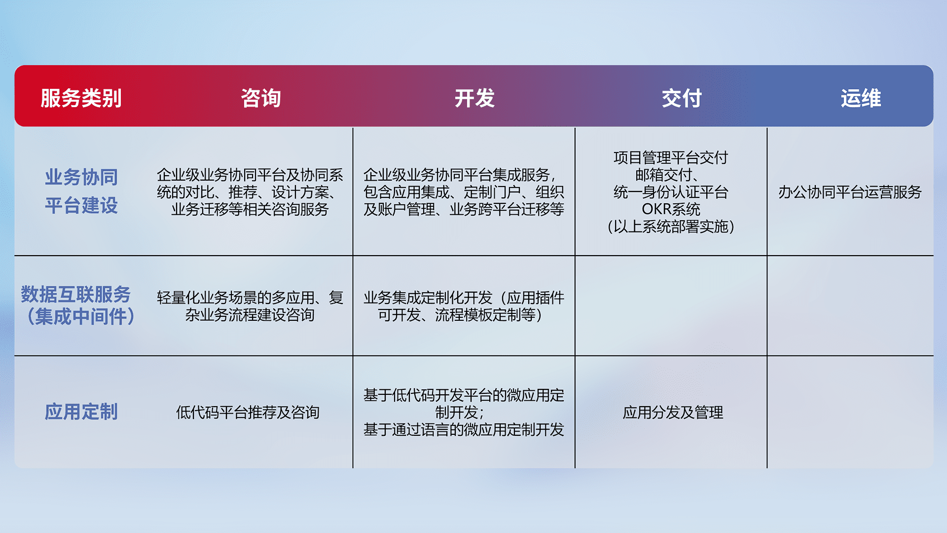 针对钉钉、、、、企微、、IDaas等平台级产品提供产品的规划、、、方案、、、、交付、、、、定制化开发等服务,,,实现如统一协同办公、、、、智能客户服务、、、混合会议管理、、、、智能数据查询、、、、等业务场景,,实现数字化转型。。。