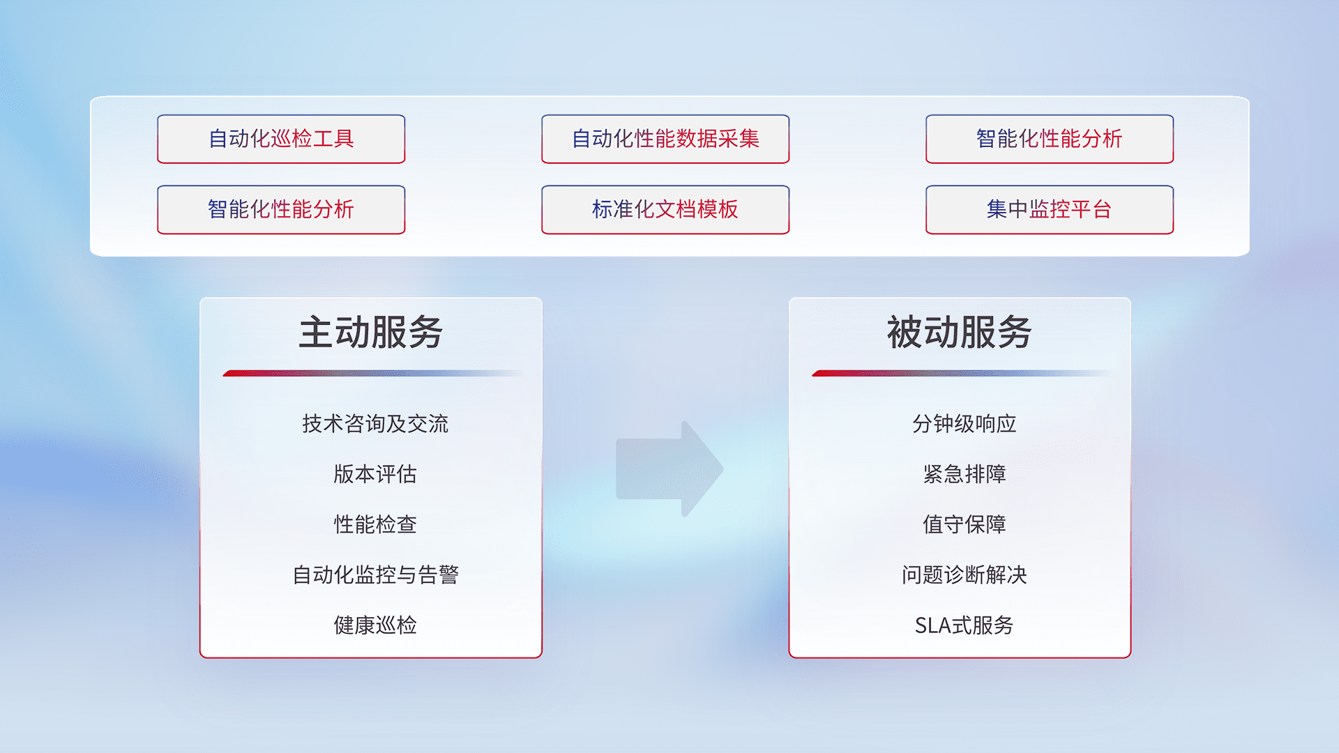 智能化工具和标准化文档,,,,保障服务质量,,提供主动服务(包含技术咨询、、版本评估、、、、性能检查、、自动化监控与告警、、、健康巡检)和被动服务包含(分钟级响应、、、紧急排障、、值守保障、、、、问题诊断解决、、SLA服务)。。